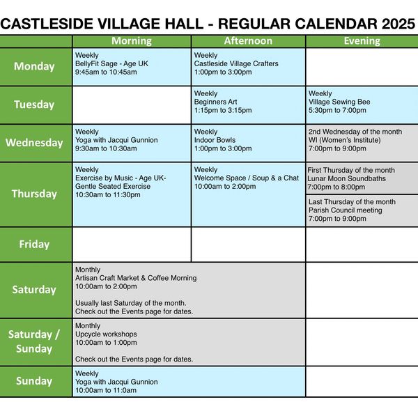 The Village Hall has a programme of regular classes, workshops and meetings that makes up a varied calendar for all ages.